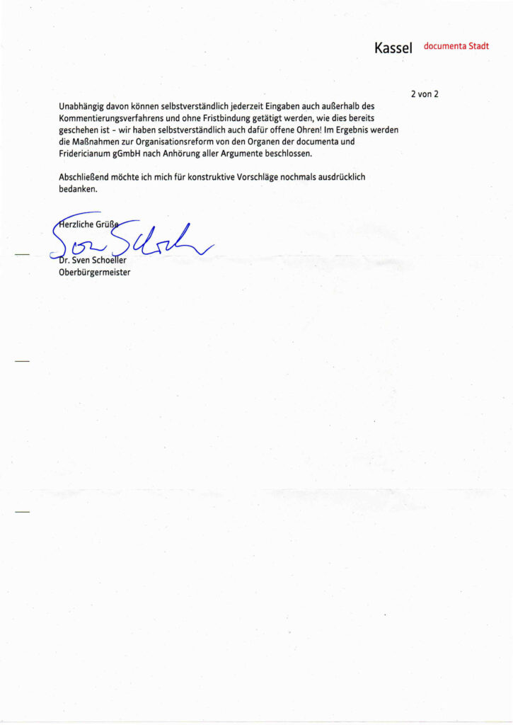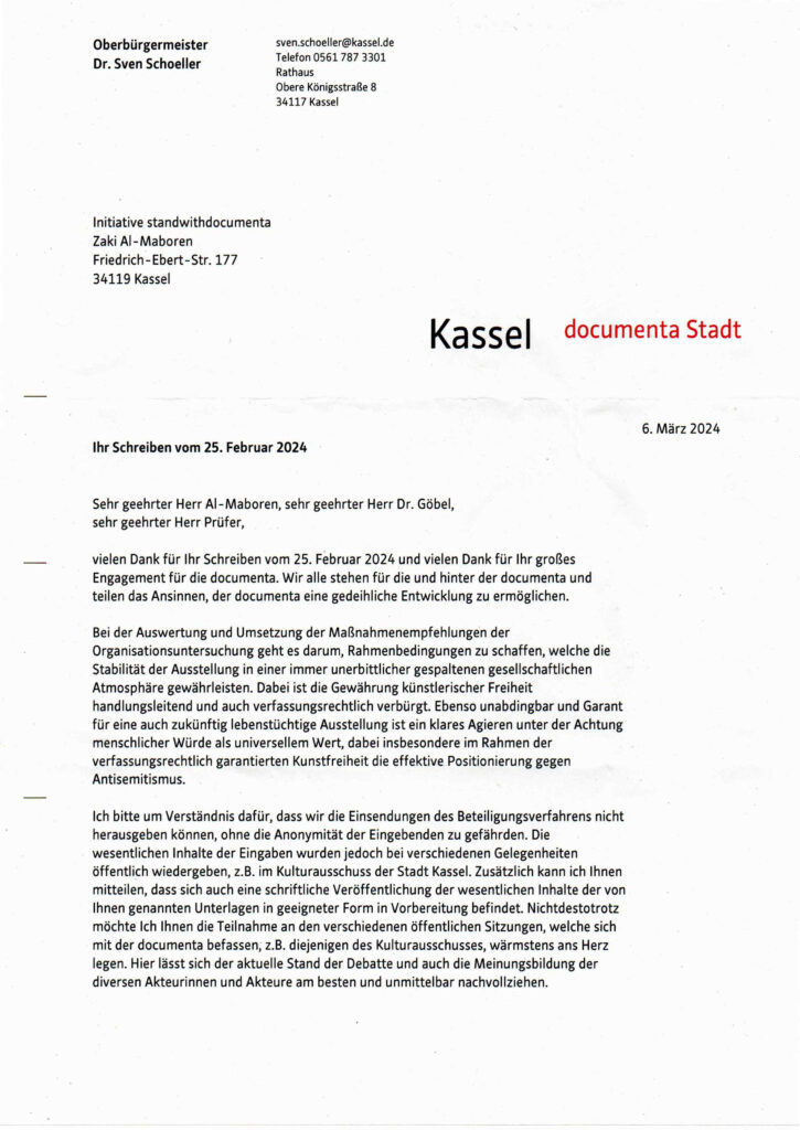 Kassel. Der Kasseler Oberbürgermeister Sven Schoeller hat es in einem Schreiben an die documenta-Initiative „standwithdocumenta“ abgelehnt, die für die Entscheidung zu den Empfehlungen von Metrum eingegangenen und beauftragten Unterlagen öffentlich zugänglich zu machen. Die Initiative hatte sich auf Schoellers Feststellung in der HNA vom 22.02.24 bezogen, über die Metrum-Empfehlungen nicht beschließen zu wollen ohne größtmögliche Transparenz zu gewähren, und gebeten, die folgenden Unterlagen zugänglich zu machen: (Link Schreiben https://www.standwithdocumenta.com/wir-fordern-groesstmoegliche-transparenz/)